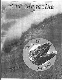 Issue sixteen was a fine issue, unremarkable except for the fact that it marked the debut appearance of the Moray Eel Approved logo (on the cover). The Moray Eel Logo has become a secondary logo for YIP, for more than any other sea creature the incredibly ugly and constantly surprised-looking Moray Eel symbolizes all that YIP stands for. The "I'm Full" feature here appears for the first time in its original colour!