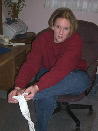 Mandy puts some socks on.